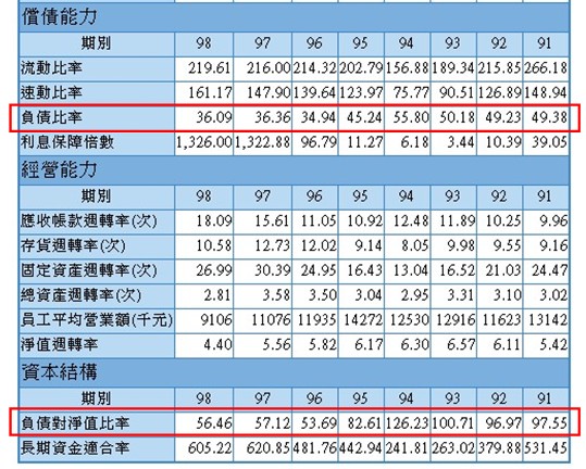 負債比也降低,負債對淨值比率也降低
